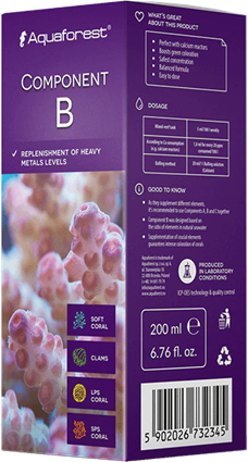 Component B is designed for complementing minor deficiencies of heavy metals in a marine aquarium. Contains: cobalt, copper, chrome, manganese, zinc, nickel, iron. Skimmer and filtration media tend to remove trace elements from the water of closed aquarium system, making micro nutrients supplementation necessary. The unique composition of the preparation ensures supplementing the water with heavy metals essential in the reef aquarium. Component B was designed based on the ratio of elements in natural seawater. Due to supplementation of crucial elements the corals will gain intense coloration and stay in fantastic condition. Safe concentration of the preparation minimizes the chance of micro nutrients overdose, therefore Component B can also be used by novice aquarists.