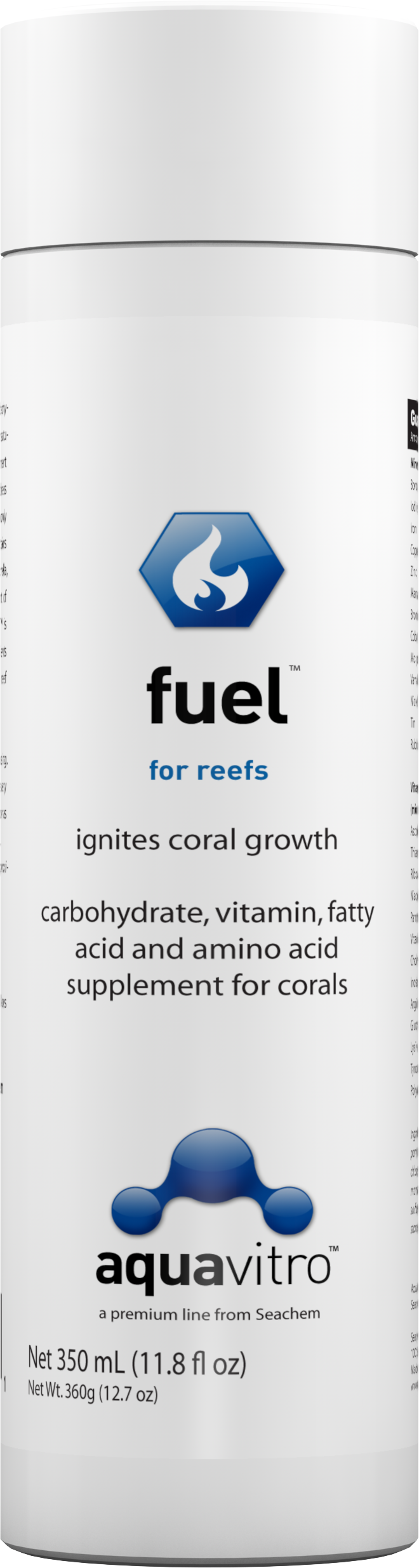 fuel is a comprehensive carbohydrate, vitamin, amino acid, polyunsaturated fatty acid, and trace element supplement developed to address nutritional requirements commonly associated with corals. fuel contains ascorbic acid in a base of chlorella, which contains a rich assortment of amino acids and vitamins. The health benefits of chlorella are widely known and while spirulina, a similar algae, has been regularly used in the industry, aquavitro is the first to utilize the vastly superior chlorella. fuel is formulated to provide nutrients available from natural tropical reef waters.