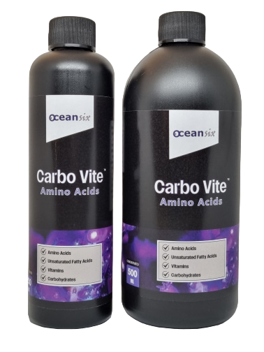 OceanSix Carbo Vite is a blend of essential amino acids, carbohydrates, and vitamins specifically formulated for the reef aquarium. These nutrients are easily depleted through biological processes and protein skimming but are essential for coral health and growth. Suitable for all marine reef aquariums and is safe for all corals and invertebrates. Does not contain any phosphates, nitrates, or sulphides.