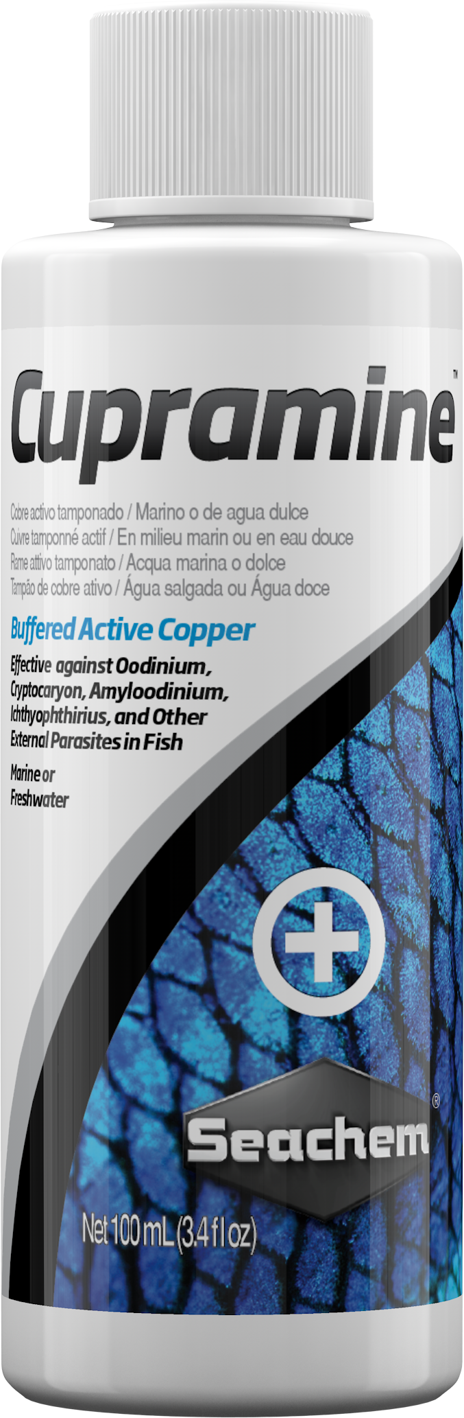 Cupramine effectively eradicates Oodinium, Cryptocaryon, Amyloodinium, Ichthyophthirius, and other ectoparasites of both freshwater and marine fish. It is superior to copper sulfate, chloride & citrate: it is non-acidic, less toxic to fish, remains in solution, and does not contaminate the filter bed. It is superior to chelates: it is fully charged (ionic), active at low concentrations, and is removable with carbon.