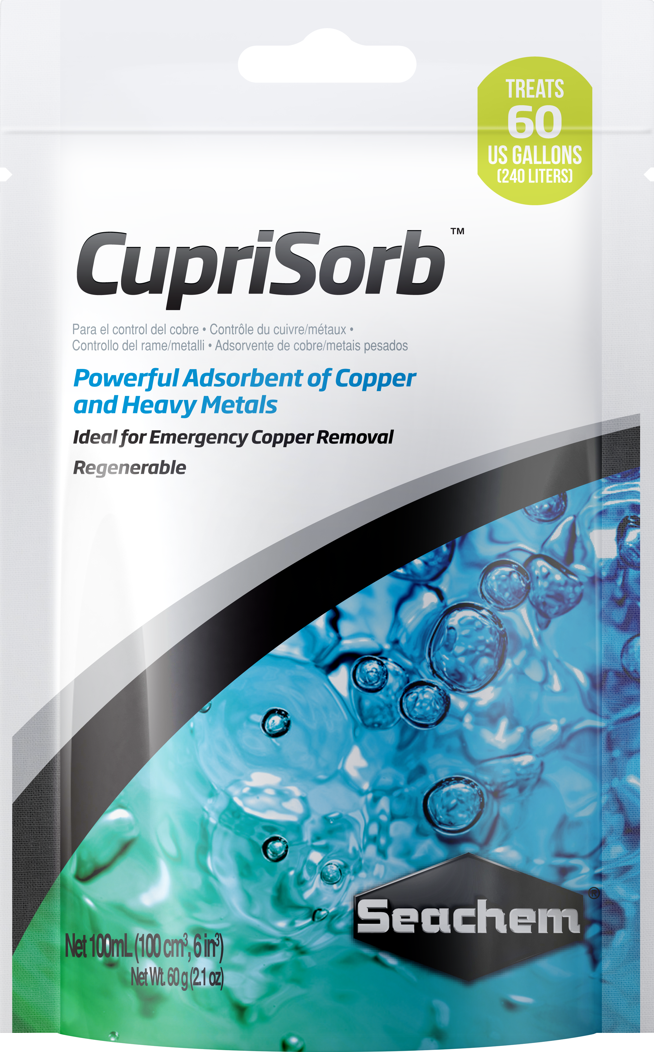 CupriSorb is a powerful adsorbent of copper and heavy metals. CupriSorb will remove copper more rapidly and efficiently than carbon and is thus ideal for emergency copper removal. It extracts all types of copper, including chelated copper, and remains effective until it turns a deep blue-black color. It may be regenerated repeatedly. If placed in continuous use, it will gradually extract even precipitated copper from the gravel/substrate bed as well. CupriSorb will allow maintenance of invertebrates in copper-treated tanks by removing copper leaching from substrates.